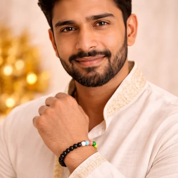 This bracelet is crafted with natural black stone beads combined with seven vibrant chakra beads, each representing one of the body’s energy centers. Designed for daily wear, it blends spiritual purpose with modern style.